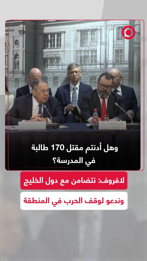 وزير الخارجية الروسي سيرغي لافروف، يؤكد تضامن روسيا مع دول الخليج التي تعاني من تداعيات الصراع، مطالبا بضرورة إدانة كافة أشكال العنف والعمل لوقف الحرب فورا.