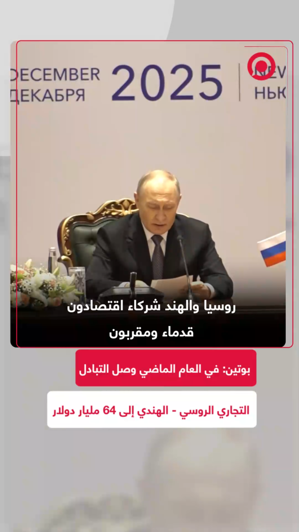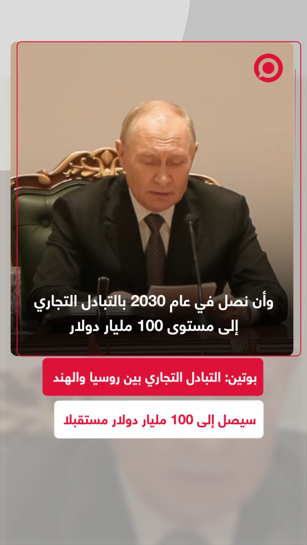 Play/Pause Mute/Unmute بوتين: في 2030 سيصل التبادل التجاري لـ 100 مليار دولار بين الهند وروسيا Save post Share Facebook X VK.com Telegram
